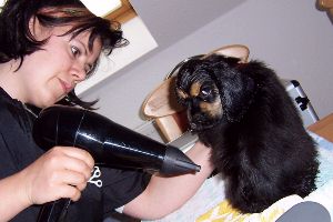 Turbofön. Der Hund kann es sich währenddessen auf dem Trimmtisch