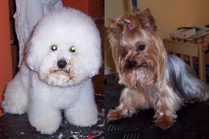 Bolognesern, Yorkshire Terriern und anderen Hunden mit Kamm und Schere